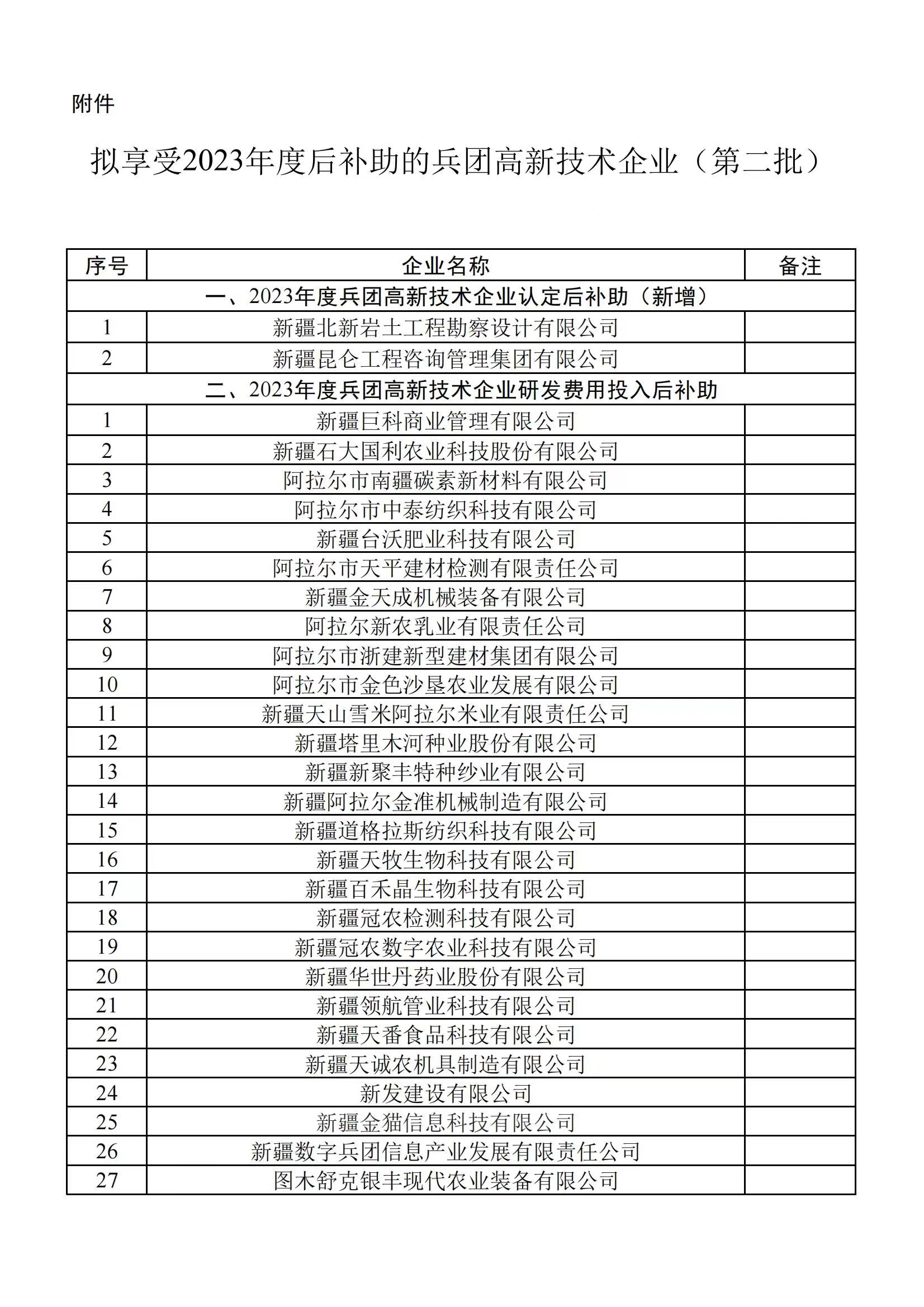 根据《兵团高新技术企业 科技型中小企业后补助暂行办法》(兵科发〔2022〕15号),经资格初审、自治区科技厅复审、新疆税务局核查等程序,确定了拟享受2023年度后补助企业(第二批)。