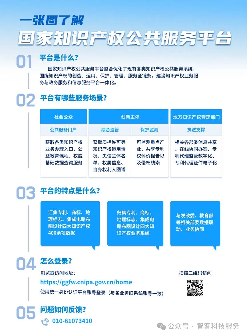 为提升知识产权公共服务数字化、智能化和便利化水平,国家知识产权局完成国家知识产权保护信息平台项目建设,将国家知识产权公共服务网升级改造为国家知识产权公共服务平台。平台集执法支撑、综合监管、保护监测等功能,便利知识产权信息“一站式”查询,实现专利代理师资格考试、专利代理机构审批、专利和商标代理监管等电子化业务办理流程。