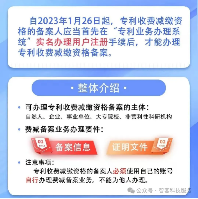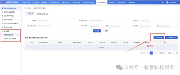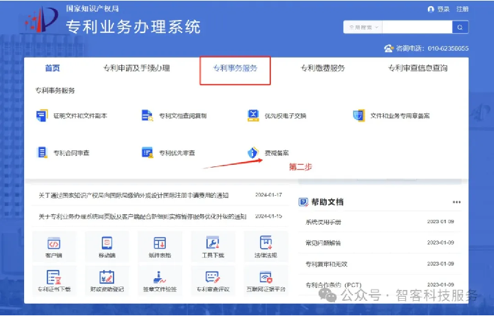 第二步:选择“专利事务服务”栏目,点击“费减备案”。